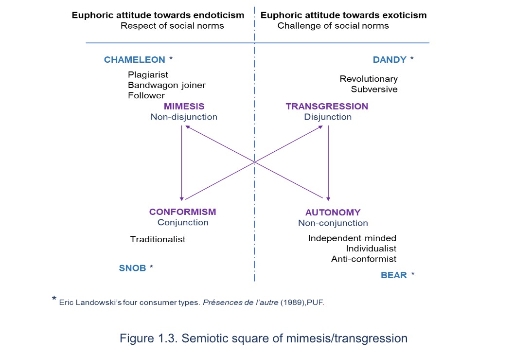 We can position the two behaviors on a tentative semiotic square where the semantic axis, mimesis vs. transgression, corresponds respectively to the traditional non-disjunction and disjunction positions (see Figure 1.3). On the contradiction axis of Mimesis, Autonomy characterizes the absence of it. This corresponds to the behavior of an independent-minded, individualist, and anti-conformist individual, whom Landowski (1997) called the Bear in his classification of the four consumer types 3 based on their attitudes toward consumption and social interaction. The contradiction axis of Transgression is Conformism, which can be related to Landowski’s Snob type, who anticipates everybody in the coming fashion trend. The Chameleon type corresponds to the mimesis behavior, while the Dandy transgresses.